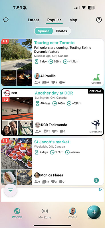 - Worlds: Discover Spimes from all over the globe — including Latest, Popular, and Map views.